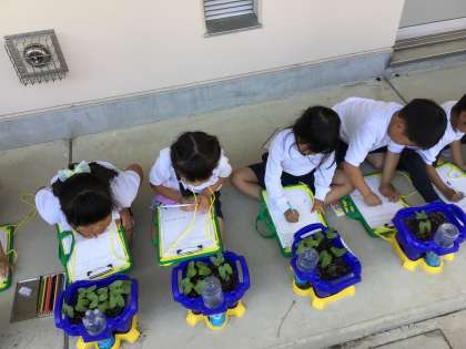 朝顔の観察をしました。葉をよく見て本物そっくりに絵を描きます。よく見ることで「葉っぱは緑色や黄緑色だけじゃない」「紫色も混じってる」「葉っぱにしわがいっぱいある」など細部に気づくことができました。触ったり、朝顔さんの声を聞いたり、朝顔との心の距離がグッと近づいた時間になりました。