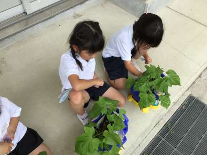 朝顔の本葉が出てきたので、肥料をまきました。朝顔はどこから栄養を食べるのかを考え、「根っこから吸い取るからできるだけ根っこの近くに肥料を置いてあげよう」と話し合いました。