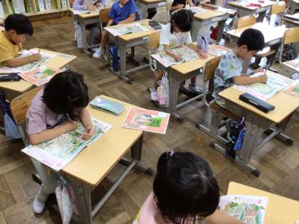 教科書の絵の中から良いことをしている動物、わるいことをしている動物を探します。写真は良いことをしている動物を探して丸で囲んでいます。