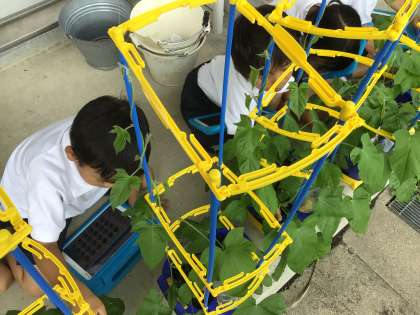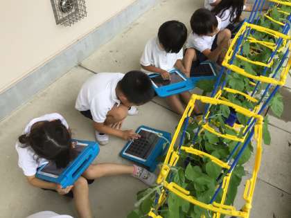 朝顔も大きく成長し、葉っぱの数も増え、大きくなりました。葉っぱの数を数え、タブレットの発表ノートに記録しました。これからの成長が楽しみですね。