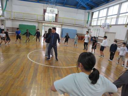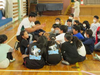 5年生が、トヨタヴェルブリッツの松山選手を夢先生に迎え、一緒に運動したり話を聞いたりしました。