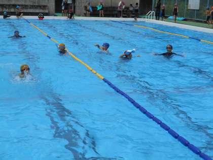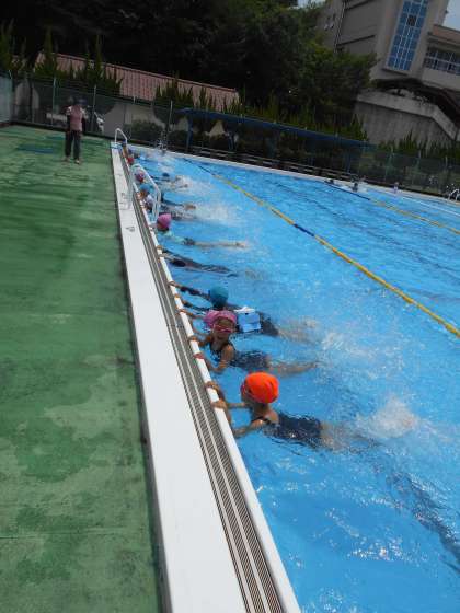 とても暑かった今日はプール日和でした。クロールのバタ足と平泳ぎのカエル足の練習をしました。