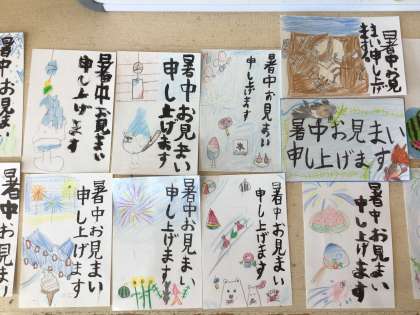 7/18 書写の時間に 公開日 2023/07/18 更新日 2023/07/18 第5学年の様子 毛筆で、一発本番で、暑中見舞いの字をしたためました。 その後、色鉛筆でアレンジ。一部を紹介します。 風流です。 5年