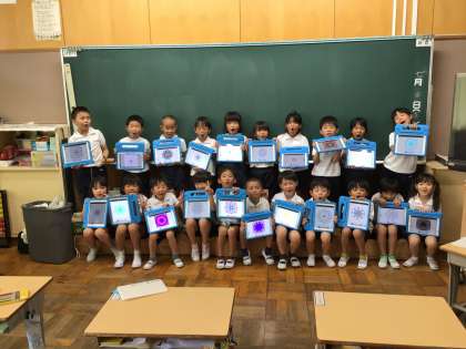 5時間目のお楽しみ会の様子です。これまでぬりえを頑張ってきた1年生。今日はぬりえを作る側を体験しました。アイビスペイントをつかって色々な模様作りをしました。