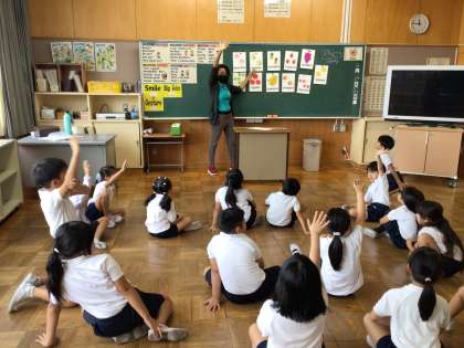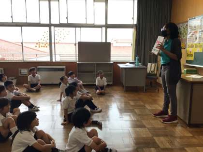 シャンティ先生と、果物の単語練習をしました。”I like apples!”などと好きな果物を友達と元気に言い合うことができました。