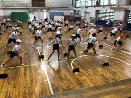 ソーラン節の練習をしています。授業の最後には自分の踊りを録画して見返しました。