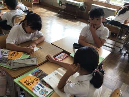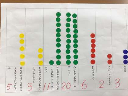 9/20 社会「スーパーマーケットの工夫を調べよう」(3年) 公開日 2023/09/20 更新日 2023/09/20 第3学年の様子 社会科の学習では、スーパーマーケットの工夫について学習しています。買い物調べを集計し、なぜわざわざ遠いお店に行く人が多いのか?についてグループで話し合いました。そして、実際にスーパーマーケットの見学で見てきたいこと、聞きたいことを、見学カードにまとめました。