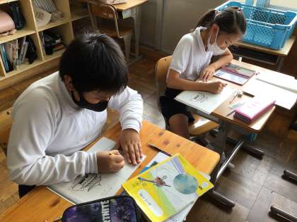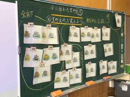 室町文化の学習をしました。金閣寺と銀閣寺が、どんな色をしているのか予想しました。「全部金と銀だと思う」,「部分的に銀色なんだと思う」といろんな意見が出ました。銀閣寺が銀ではないのは有名ですが、実は金閣寺の1階は金ではありません。修学旅行で自分の目で確かめに行きます。