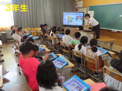 今日は、スクラッチを使ってプログラミングの学習をし、基本から応用まで学年に応じて操作方法を学習しました。