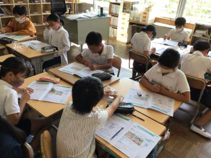 透明カップに、水を入れます。ラップをかぶせたラップとの違いを調べ結果をまとめました。結露や水蒸気について、協働的に学んでいます。