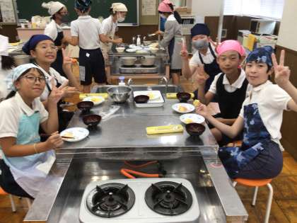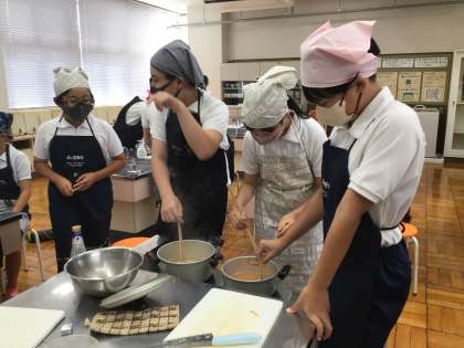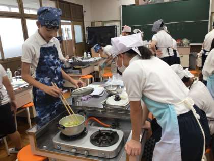限られた材料で、グループごとに工夫し、副菜と汁物の2品作りました。