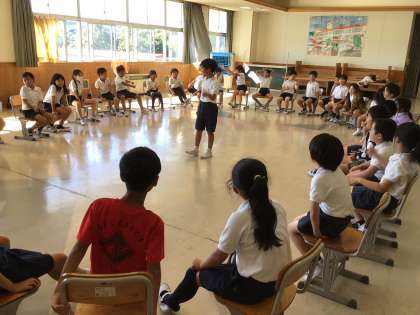 9月生まれの子と、7月の誕生日会に参加できなかった7月生まれの子の誕生日会を行いました。誕生日の子は9歳の1年で頑張りたいことを発表しました。その後、みんなで「フルーツバスケット」「じゃんけんバスケット」「何でもバスケット」をして楽しみました。