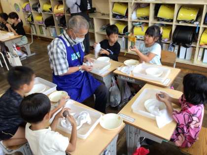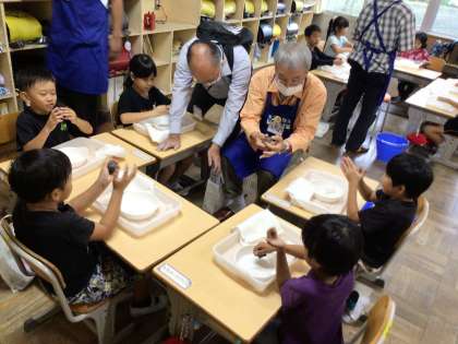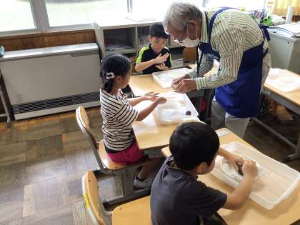 立方体の頂点にを押しながら、少しずつ丸にしています。一班に一人ずつサポーターがついて作り方を教えてもらいました。