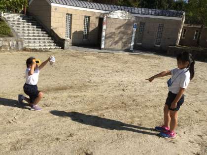 二人一組で影の向きと太陽の位置の関係を調べています。太陽の位置は遮光板を使って確認しました。