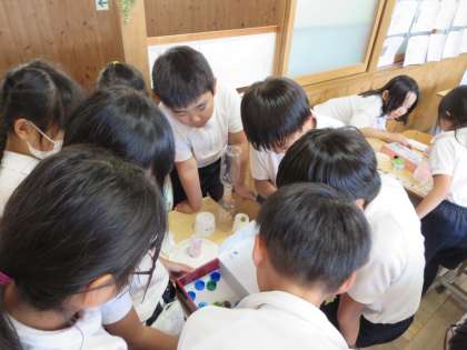 9月から始まった「つくる 楽しさ はっけん」の第一次のまとめとして、一人一人が作ったおもちゃの発表会をしました。それぞれの机をまわって、どんな工夫がしてあるのか聞いたり、一緒に遊んだりしました。第二次では、もっと楽しく遊ぶためにはどうしたらよいかを考えていきます。