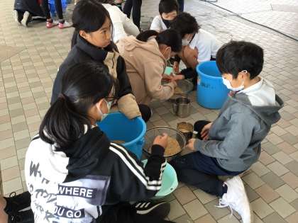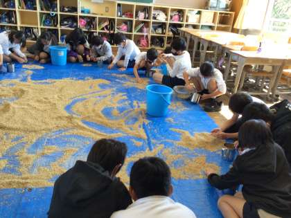 JAの方、ボランティアの協力を得て、もみがらを玄米にしました。
