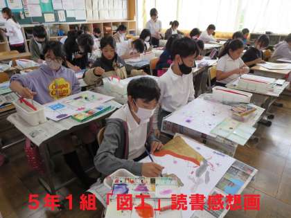 5年1組の図工は、毎年恒例の読書感想画の制作をしていました。「ちいさな ちいさな」というお話の絵を描いています。