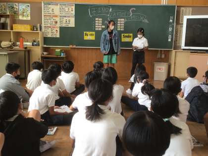 学習した会話文を使って、食物連鎖の様子を表現する文を考え、発表しました。