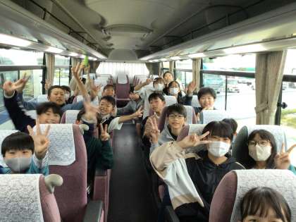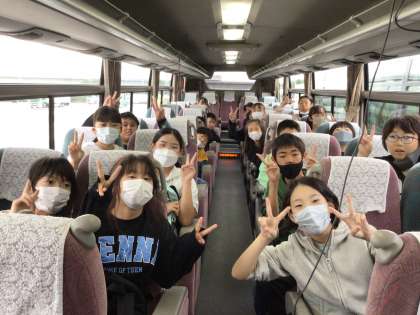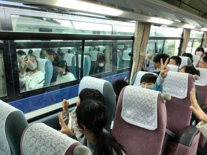バスレクで楽しんでいます。気づいたら雨が上がり、晴れ間が出てきました。みんなで見る景色は一味違うようです。