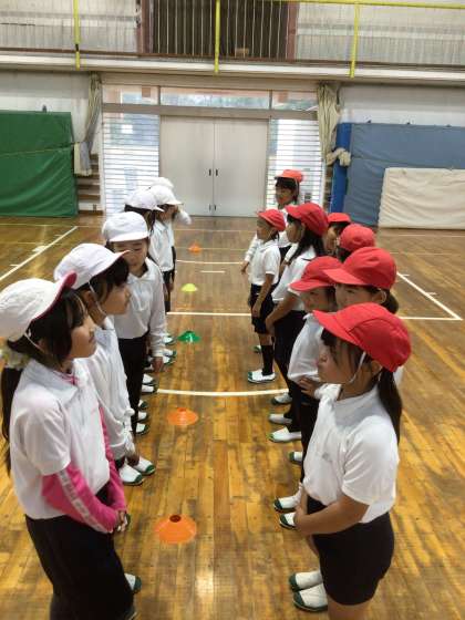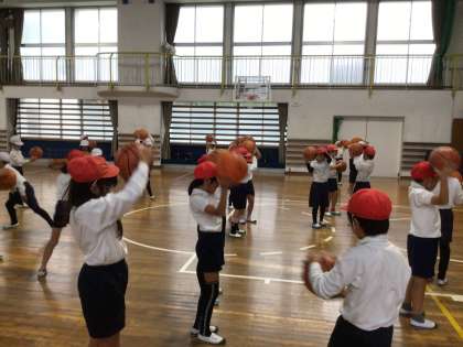 雨が降っていたので、体育の学習は体育館です。バスケットボールでボールに慣れた後、男女分かれてドッジボールを行いました。