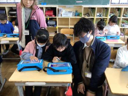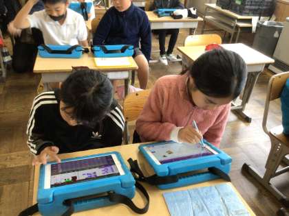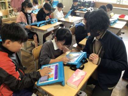 国語で作った物語を、スクラッチでプログラミングしていますが、思った通りに動かす方法が分からないことがあります。今日は、ICT支援員の先生に、困っていることを教えてもらいました。