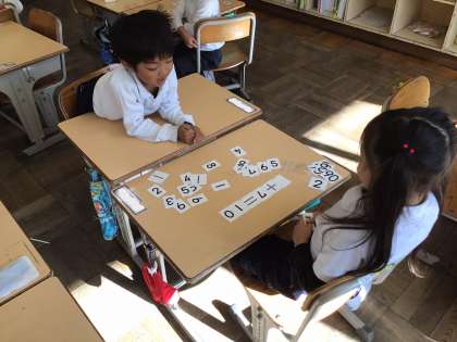算数「ひき算⑵」の学習の様子です。たし算やひき算の式を作り,記号や数字のカードを一枚裏返してクイズを出し合いました。