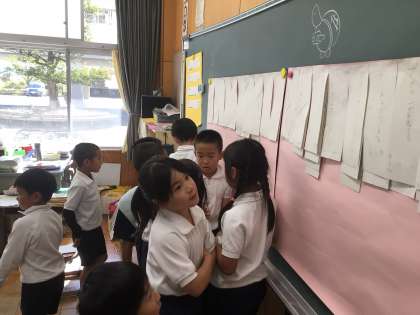 国語「ことばであそぼう」の学習の様子です。動物や食べ物などの名前に注目してだじゃれをみんなでたくさん書き出しました。