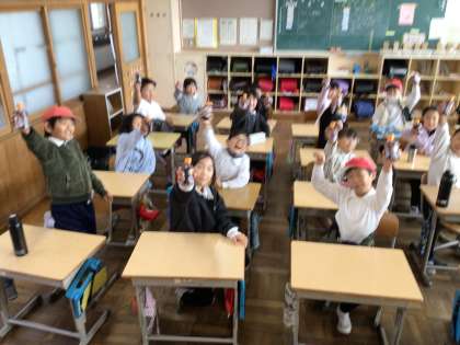 みんなでがんばった記念にPTAからいただいたココアで「かんぱーい!」をしました。