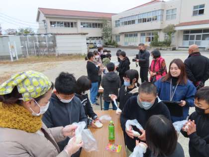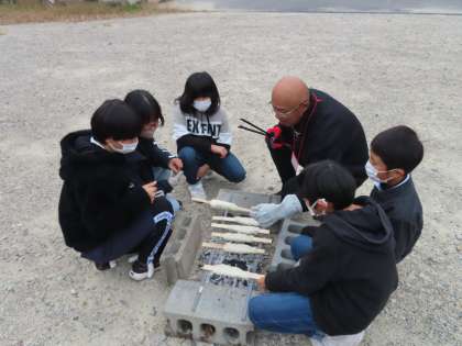 その後、ボランティアの皆様に準備をしていただき、収穫したお米で五平餅を作って食べました。