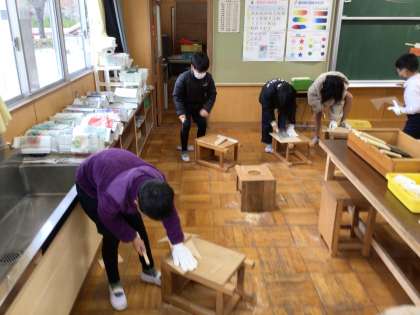 図工は、「ギコギコトントンクリエータ」という単元で、のこぎりを使った木工工作です。初めてのこぎりを使う子もいるので、校内作業員の方にも手伝っていただき、安全に気を付けて作業に挑戦しました。