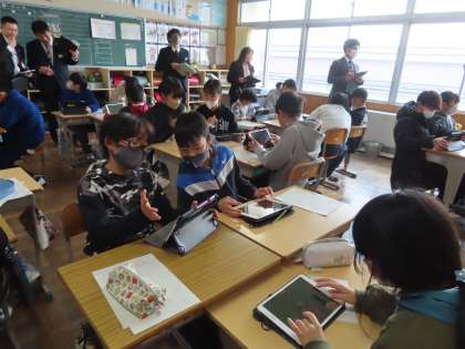 今日は、県や市の教育委員会から担当の方が視察に来校し、4時限目にICTを活用した各クラスの授業を、5時限目には4年2組の公開授業を参観しました。