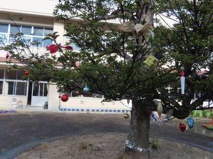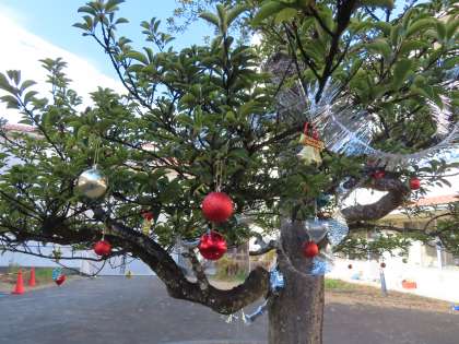 12/11 クリスマスツリー 公開日 2023/12/11 更新日 2023/12/11 お知らせ 中庭の「クロガネモチ」の木に、オーナメントが飾られていて楽しい気分にさせてくれています。さすがに全体というわけにはいきませんが、運営委委員会の児童が手の届く範囲で飾り付けてくれました。