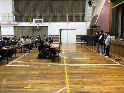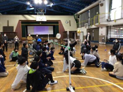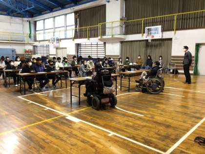 車椅子体験を中心に学んだ、ユニバーサルデザインの学習のまとめを行いました。各グループで未来を考え提案し、発想力豊かな心温かいアイディアに溢れていました。途中、休憩として風船バレーも楽しみました!