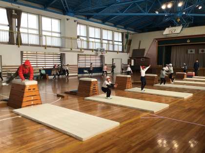 体育の授業ではマット運動の後、跳び箱に取り組んでいます。跳び台と跳び箱の間の距離をあけ、遠くから飛ぶ挑戦をしました。跳べなくてもめげずにより高い段にチャレンジする子が多くいました。