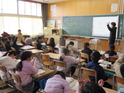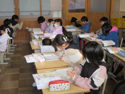 九九にないかけ算の答えのもとめ方を考えました。12×5の答えの出し方を、今まで学習したことを使い、足し算をしたり、かけ算の順番を変えたりしながら解きました。九九を覚えたあとは、かけ算を使った少し難しい計算ができるようにがんばっています。