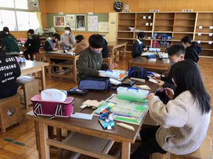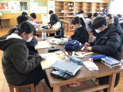 彫刻刀を使って彫る作業が進んでいます。続いて、絵の具で色付けをしていきます。