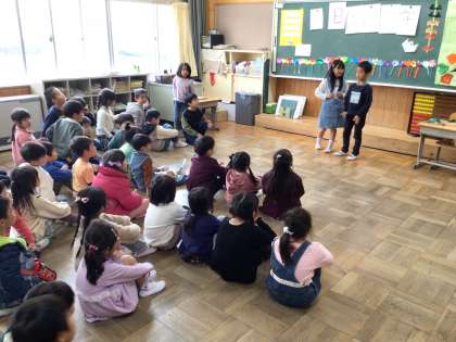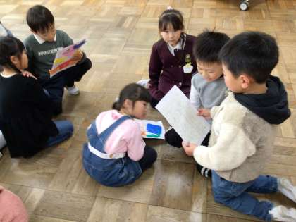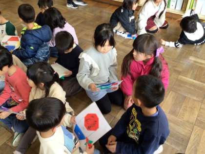プレゼント渡しです。国語で小学校のことを紹介するお手紙を書き,図工で折り紙飾りを作りました。折り紙で気球を作り,気球のポッケには朝顔のタネを入れました。一人一人にお手紙を読んであげました。