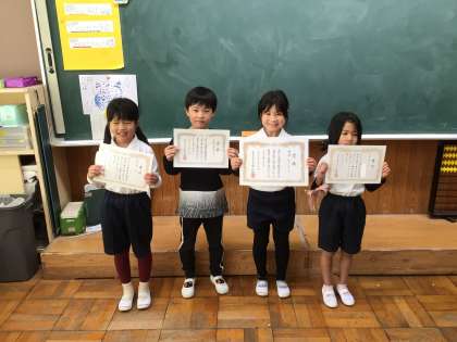 書き初め大会の金賞、銀賞、校内入選が表彰されました。