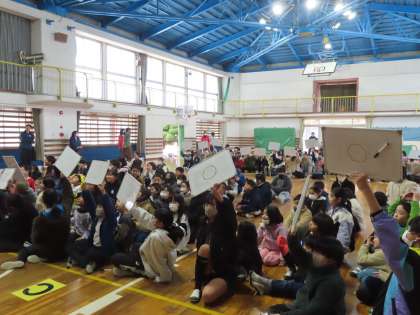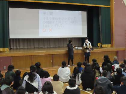 2/29 うるう年集会 公開日 2024/02/29 更新日 2024/02/29 お知らせ 運営委員会企画の「うるう年集会」を給食後に行いました。 スマイル班ごとに集まり、うるう年に関するクイズを行い、最後に「猛獣狩り」アレンジ版の「うるう年狩り」をしてみんなで遊びました。