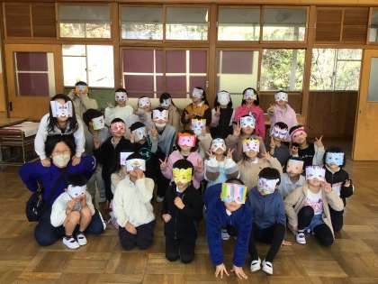 図工で画用紙を使って「変身マスク」を作りました。みんなで変身!