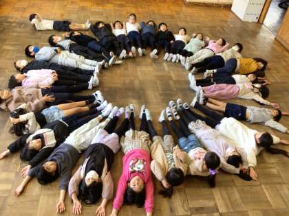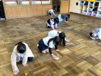 ワックスがけのために、床を何度も水拭きし、きれいになった教室でみんなで大きな輪を作りました。