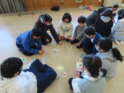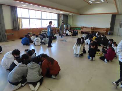 じゃんけん列車をしたり昔遊びをしたりした後に、手作りプレゼントを渡し一緒に校歌を歌いました。
