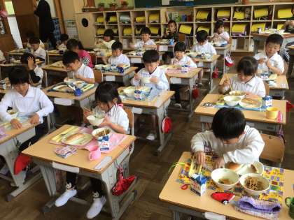 初めてづくしの1年生。今日は楽しみにしていた小学校で初めての給食です。準備や片付けの仕方を学びました。