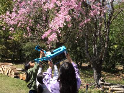 4年 理科「1年間の観察」の学習では、1年間かけて生物の観察を行います。今日は、1年観察するものをサクラに決め、自分でどのサクラを観察をするか決め、タブレットを活用し、観察を行いました。