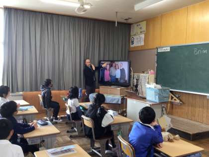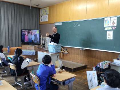 4年外国語活動では、新しいALTのブライアン先生を迎え、自己紹介ゲームを行いました。