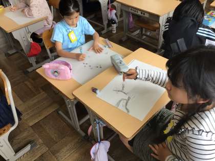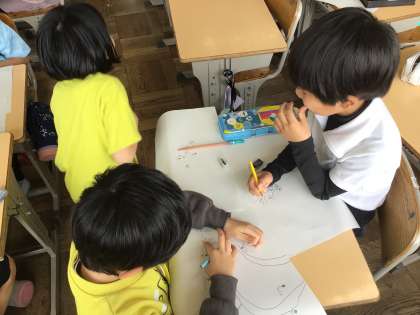 初めての社会の授業です。飯野小学校の近辺を思い出しながら、どんな建物があるかを書き出しました。