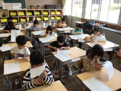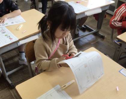 友達に自己紹介をするために、名刺を作っています。今日は4つの名刺をちょきちょき切って準備しました。