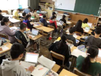 社会の学習では教科書やインターネットで調べた情報をPowerPointの共同編集で発信し、仲間の考えを学びあう授業をしています。