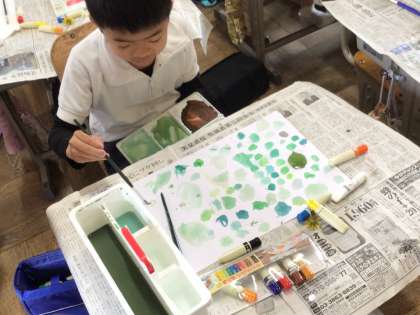 2枚目 葉を1枚だけ貼り付け、いろいろな緑色を作っていました。