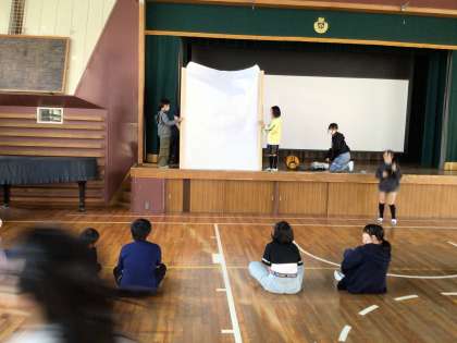1枚目 人物シルエットクイズのリハーサルで、うまく影が映らず、暗幕を閉めたりライトを調整したりして、力を合わせて工夫しました。